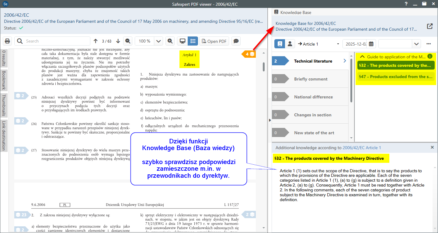 Szczególnie przydatna jest funkcja Bazy wiedzy (Knowledge Base), dzięki której można szybko rozwiać wątpliwości dotyczące oceny zgodności maszyny z wymaganiami dyrektywy.